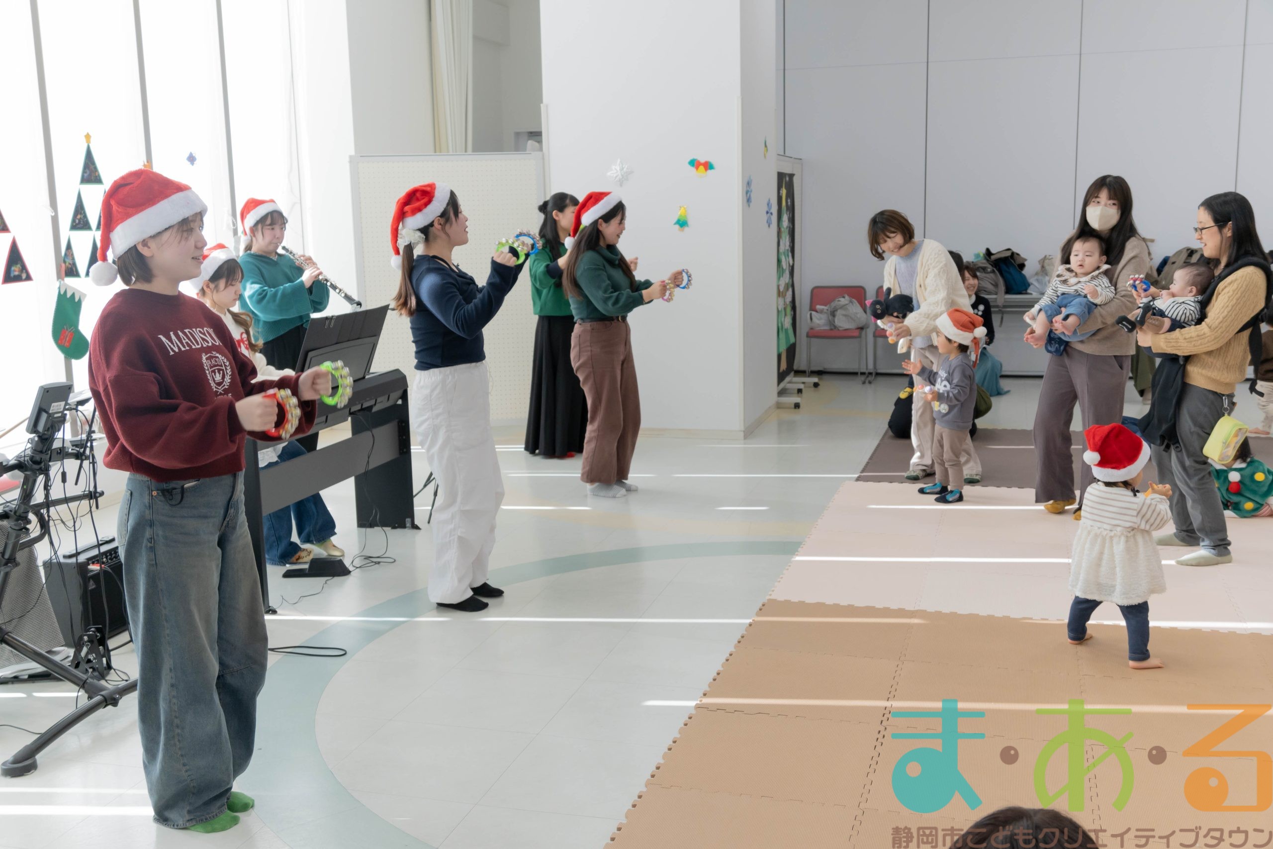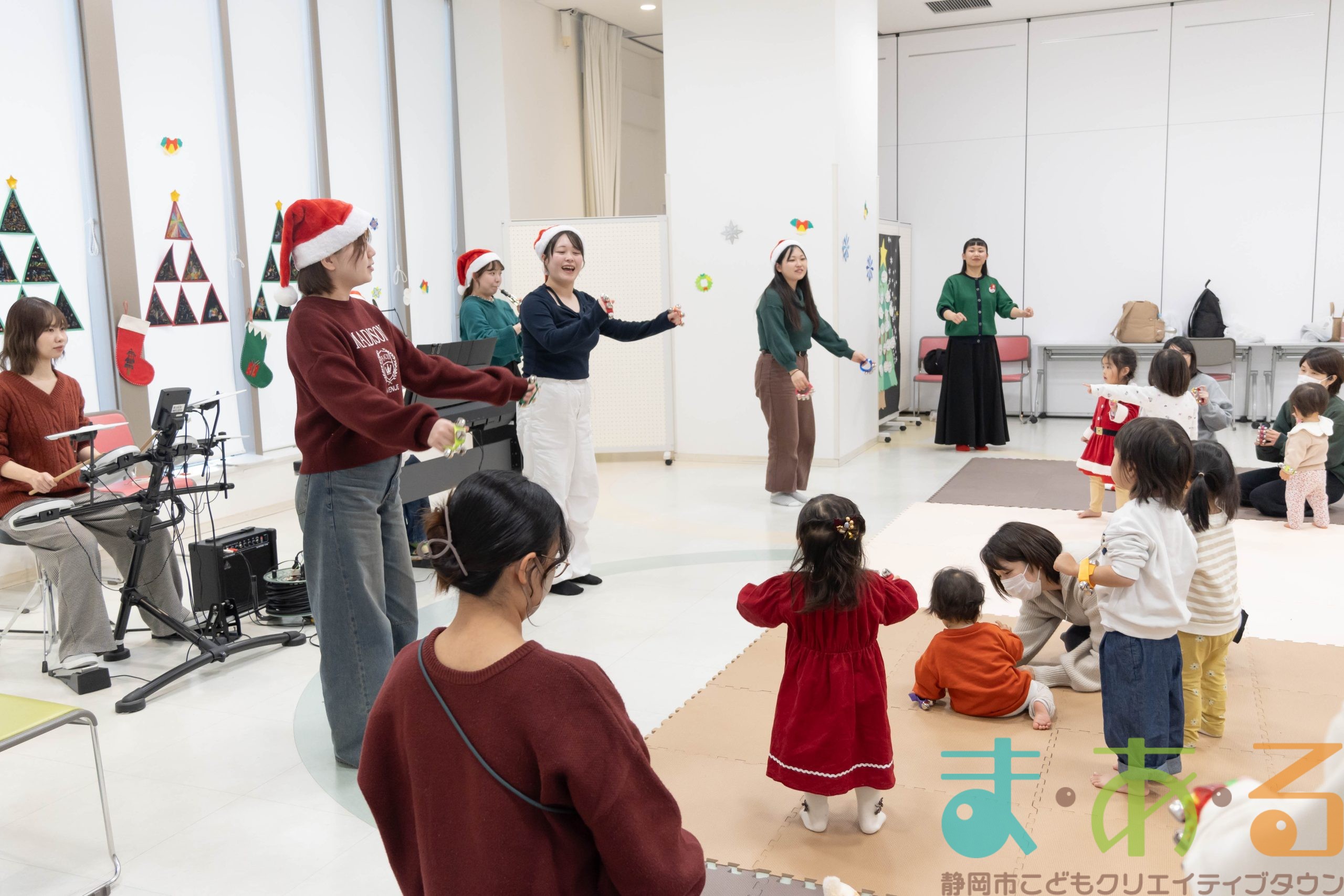 静岡市こどもクリエイティブタウンま・あ・るでは、こどもバザールや、しごと・ものづくり講座などを通じて、次世代を担う人材を育成しています。今年度も、保育・教職実践演習の一環としてこども学科の学生が「るんるん♪おんがくあそび(クリスマススペシャル)」に参加させていただきました。