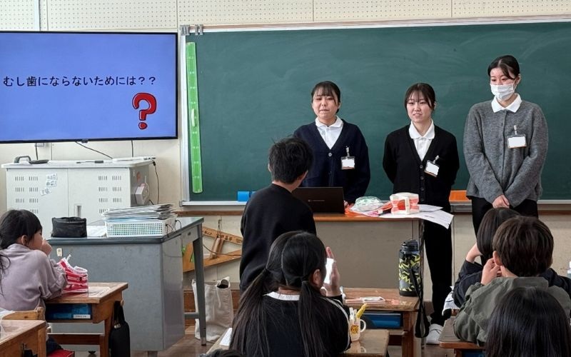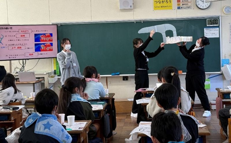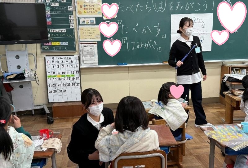学生たちは、児童の皆さんがしっかりお話を聞いてくれる様子や元気な反応に助けられ、指導計画の「ねらい」を伝えられるよう頑張りました。緊張の中にも明るく笑顔も交えながら講話し、歯みがきの練習では給食や食後のブラッシングがむし歯、歯肉炎予防に役立つようポイント等を児童一人ひとりを見て回り声掛けをしました。初めての児童への歯科保健指導は、学生にとっては大変貴重な学びの機会となりました。