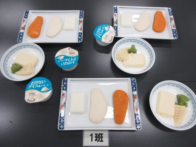 1月9日(金)の授業では、「ユニバーサルデザイン食」を食べてみて、実際に現場で利用されている食品の特徴を学びました。素材の味や見た目をほぼ再現しているところが特徴で、噛んだり飲み込んだりすることが困難になっても安全に食べる喜びと楽しみを味わうことができます。