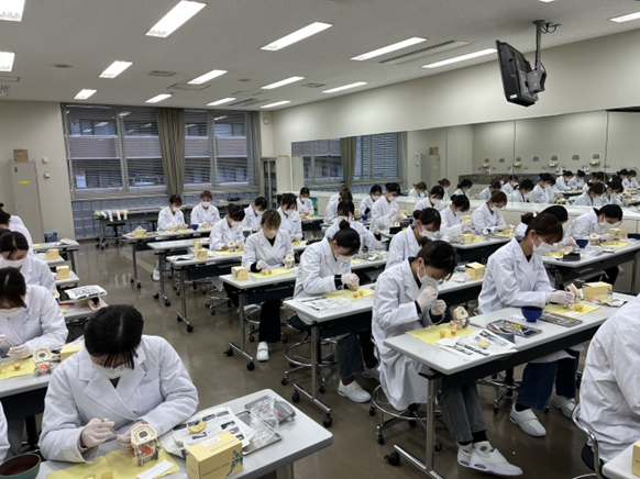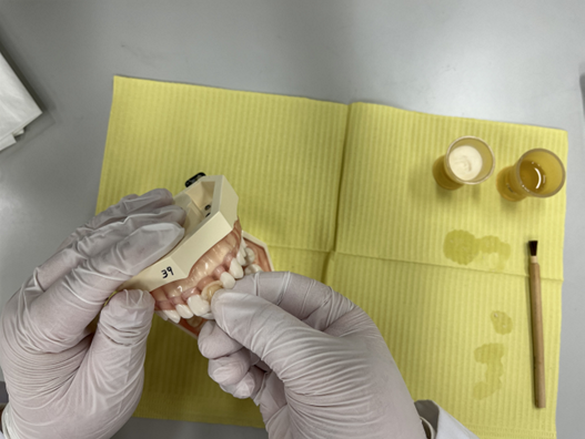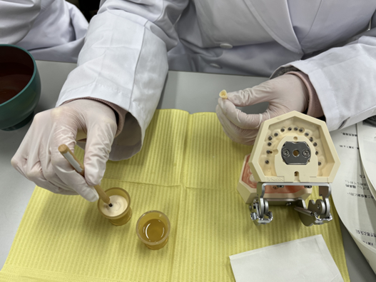 この実習では、歯科衛生士が臨床で使用する歯科材料の性質、取扱い、注意事項を正しく理解することを目的として、実際に歯型を採る時に使われるアルジネート印象材や白い詰め物として使われるコンポジットレジン、歯に被せ物を着ける時のセメント、仮歯などの歯科材料を手に取り、操作方法を体験しました。