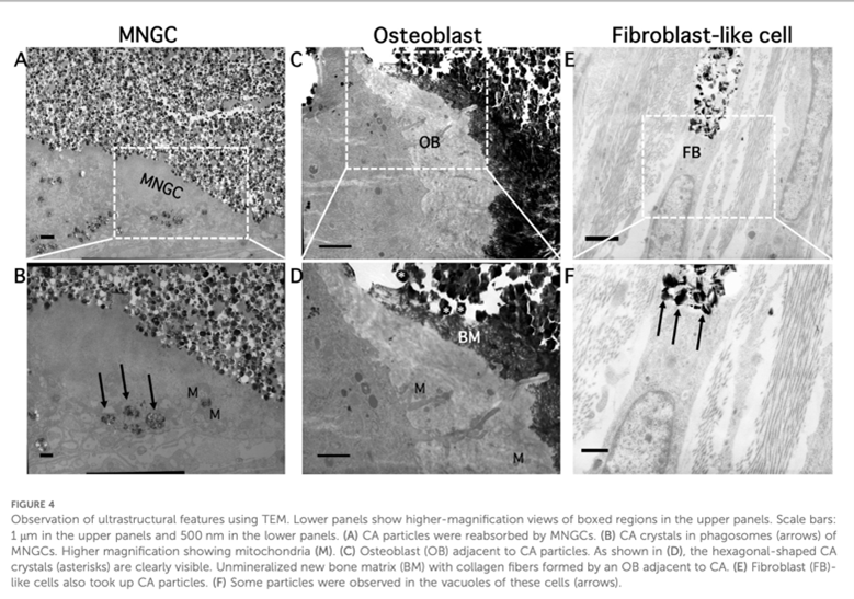 炭酸アパタイト(carbonate apatite:CA)は、その化学組成が天然骨に類似していることから、人工骨素材として注目されています。研究では、ラット大腿骨に埋入した多孔質CAの生体内吸収過程について、透過型電子顕微鏡を用いて6か月および12か月後に観察しました。その結果12か月後も破骨細胞様の多核巨細胞が存在しCAの生体内での吸収が継続していること、線維芽細胞様細胞なども吸収に関与していることが示され臨床応用の理解につながる重要な手がかりが得られました。